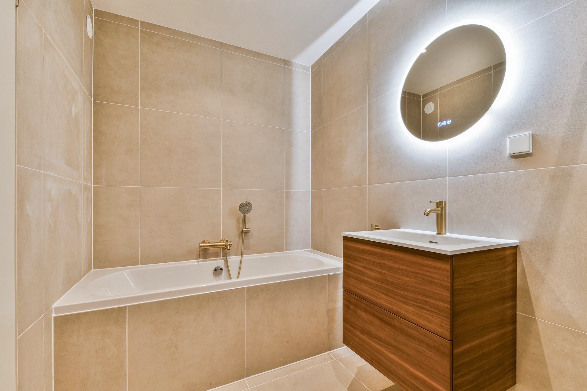 The luxury bathroom (2026) has a modern design and is equipped with a bathtub, separate shower, washbasin vanity unit, towel radiator, and underfloor heating.