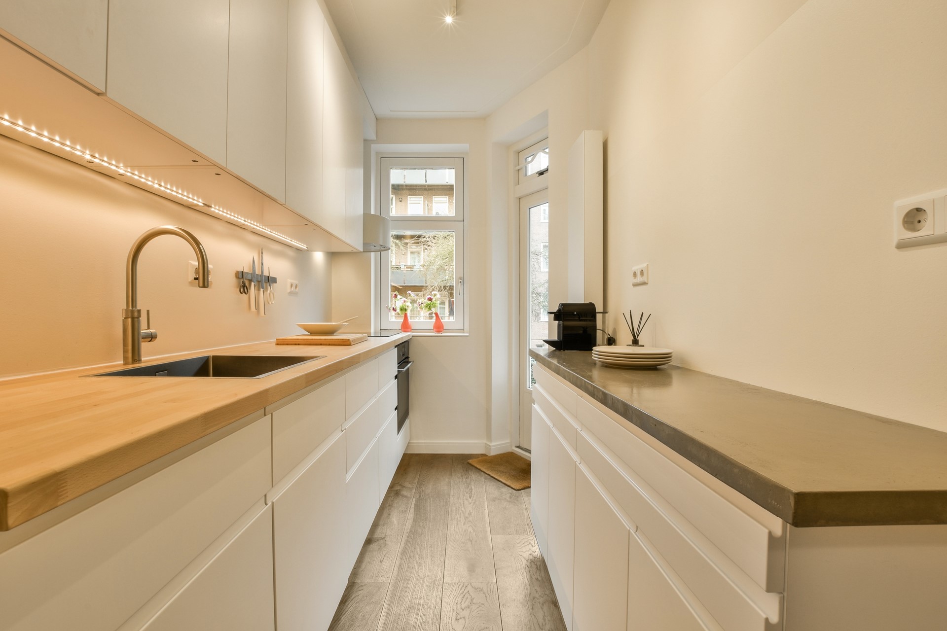 At the rear is the separate kitchen, equipped with modern built-in appliances such as a fridge/freezer, oven, induction hob, and dishwasher. From the kitchen, you step onto the sunny balcony, with stairs leading to the exceptionally spacious backyard of approx. 72 m², a wonderful place to relax, garden, or enjoy outdoor dining.