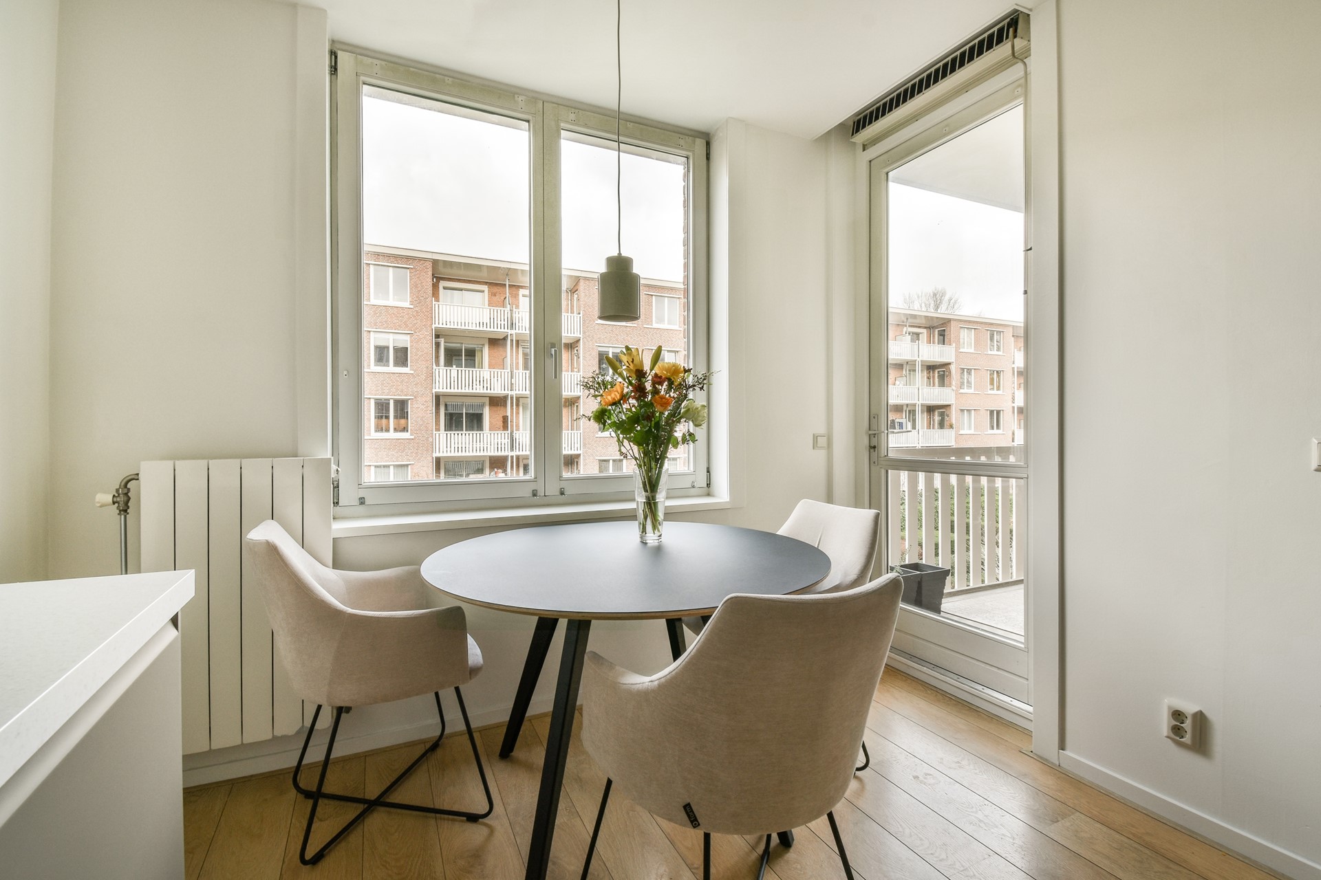 De woonkamer is licht en ruim opgezet en biedt voldoende ruimte voor een comfortabele zithoek. Vanuit de woonkamer is er toegang tot één van de twee balkons, wat zorgt voor veel daglicht en een prettige verbinding met buiten. Vanaf het balkon heeft u een parkachtig zicht op de gemeenschappelijke binnentuin. Aangrenzend bevindt zich de woonkeuken, welke is voorzien van de benodigde apparatuur en voldoende kastruimte.