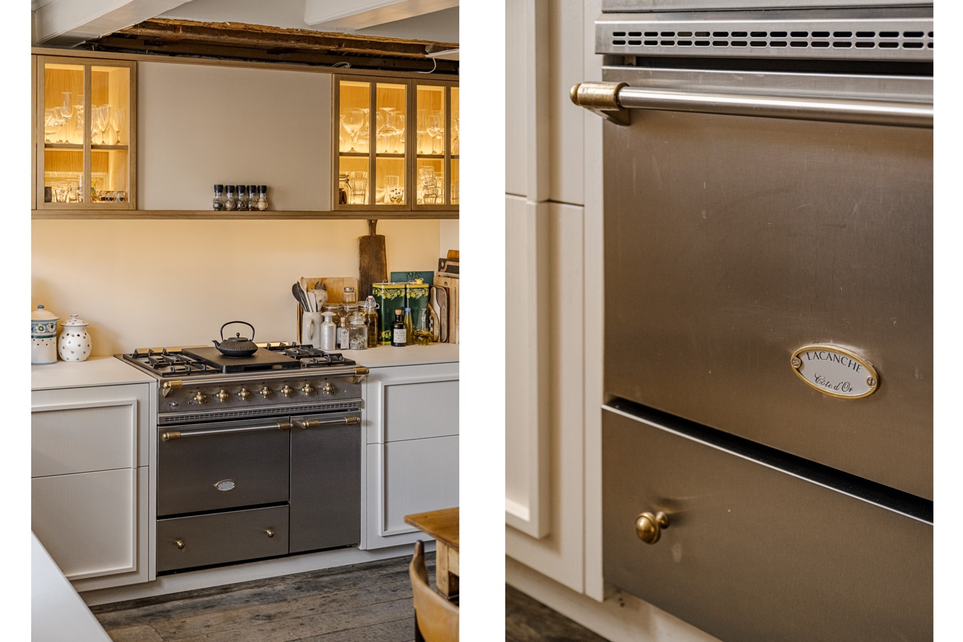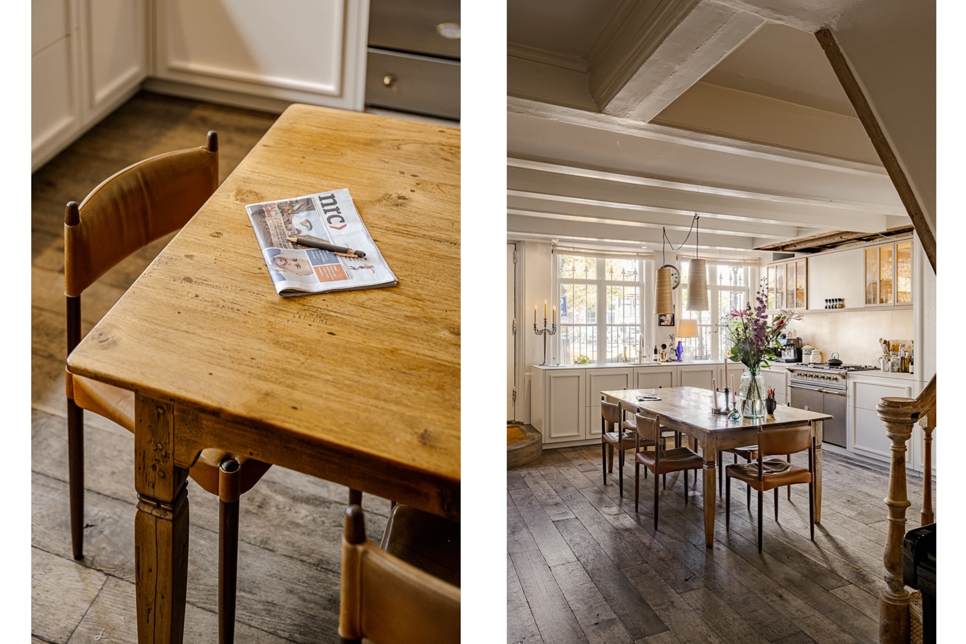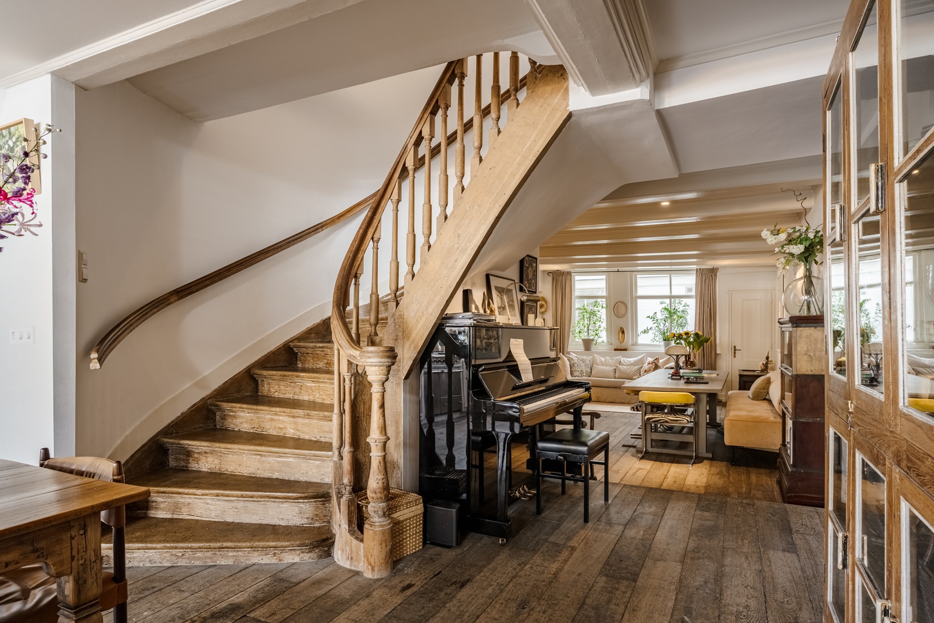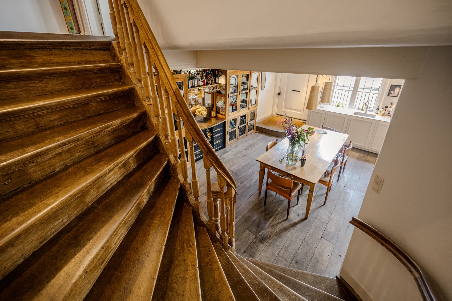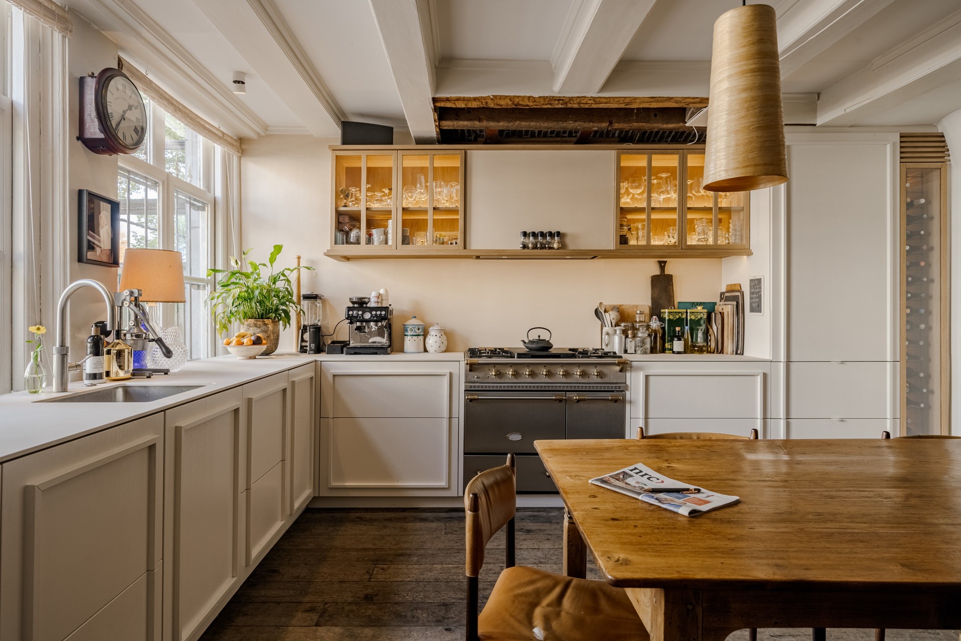 De woning verwelkomt u met een royale woonkeuken (bj. 2022) aan de voorzijde, voorzien van luxe inbouwapparatuur en grote raampartijen die uitkijken over de statige gracht. Sfeervolle balkenplafonds en de warme houten vloeren zorgen direct voor een gevoel van klasse en huiselijkheid.