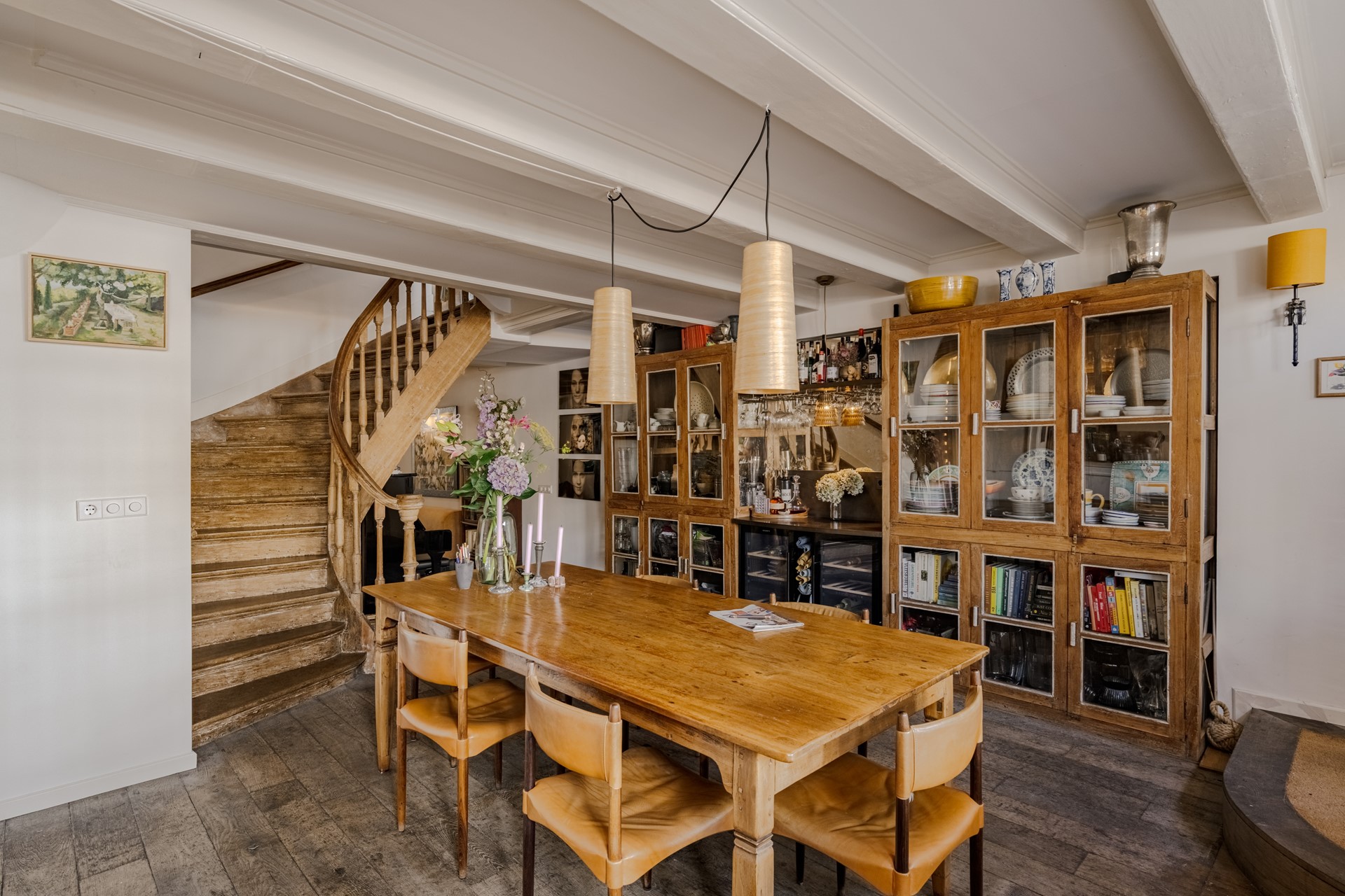 Aangrenzend bevindt zich een stijlvolle eetkamer, perfect voor lange diners en ontvangsten – een plek waar historie en modern comfort elkaar naadloos aanvullen.