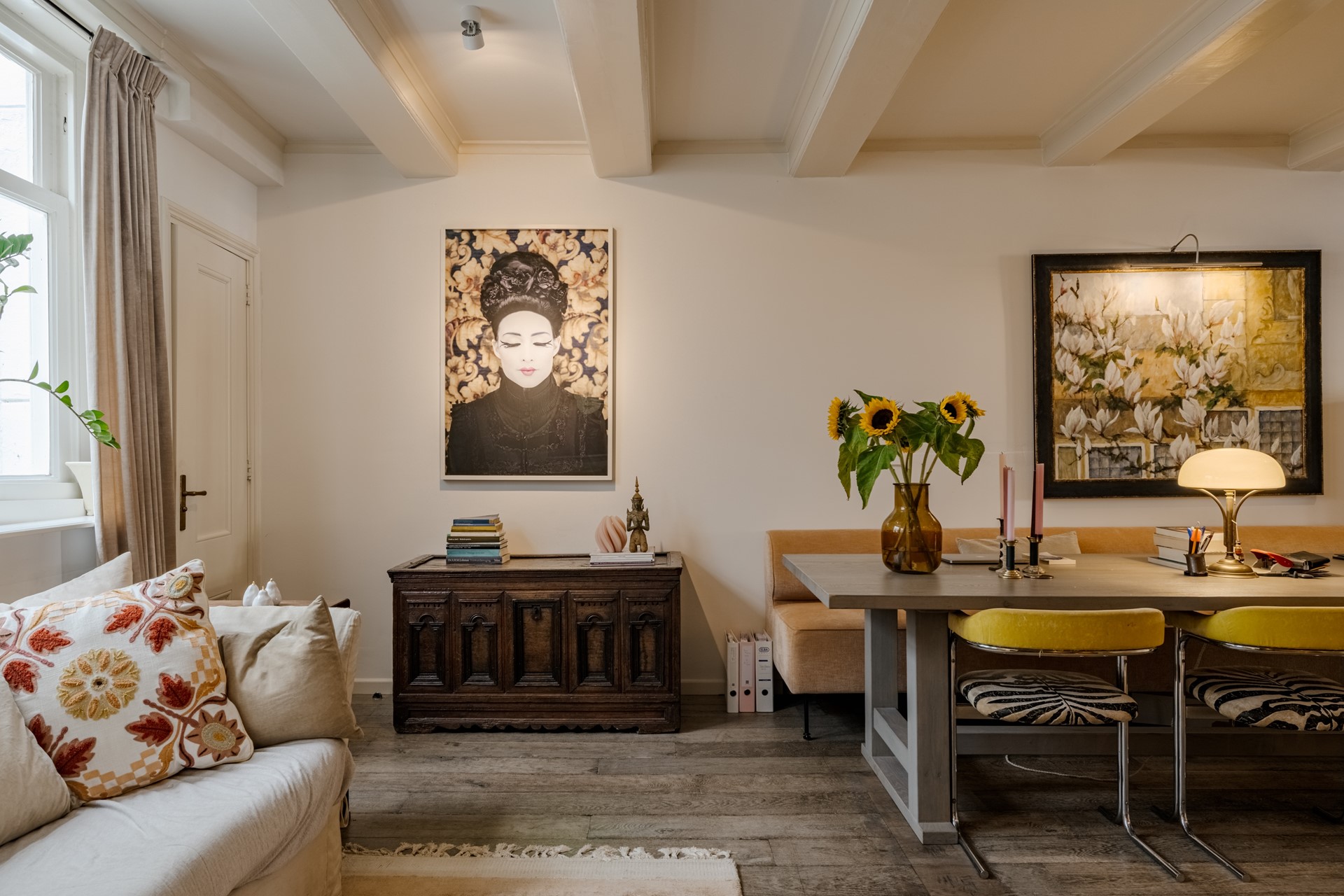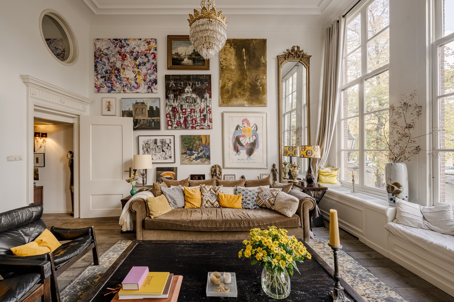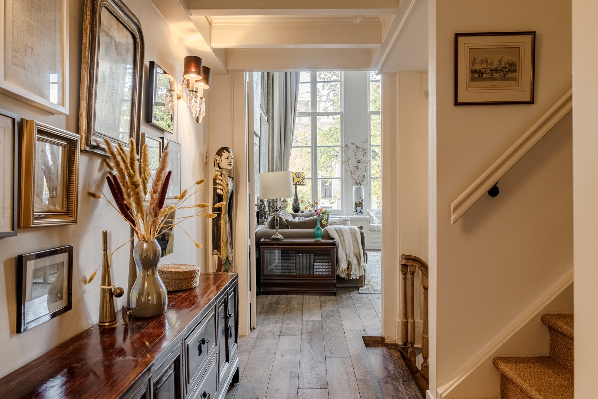 De eerste verdieping herbergt een adembenemende woon-/stijlkamer met hoge ramen en schitterend weids uitzicht over de gracht. Dit is een ruimte die grandeur ademt: hoge plafonds (ca. 4.5m!), originele details en een overvloed aan natuurlijk licht maken dit tot een unieke plek om te ontspannen of te ontvangen.