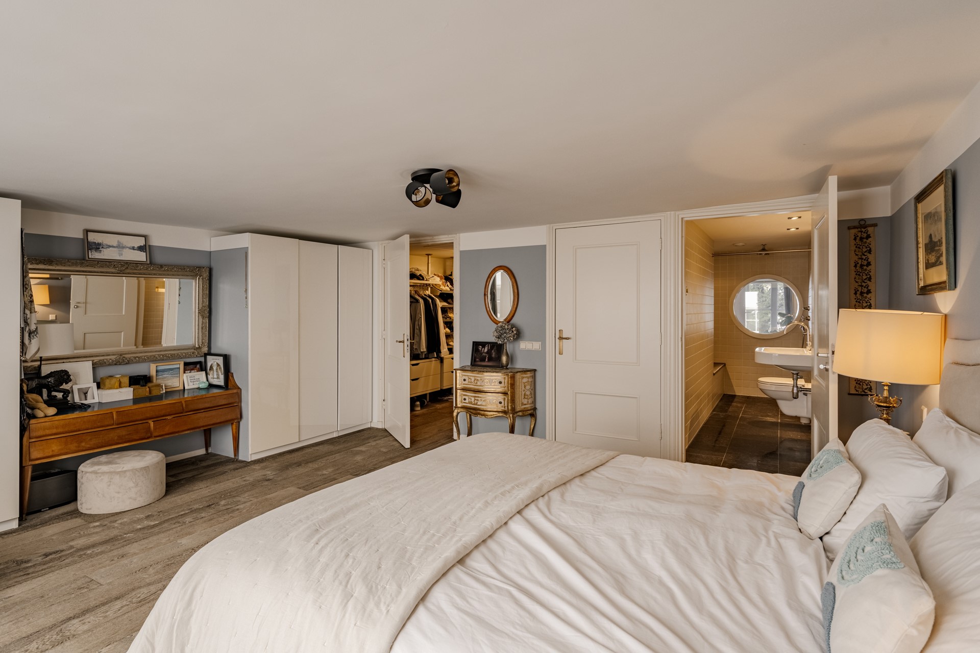 De bovenste woonlaag is volledig ingericht als master suite. Hier vindt u een riante slaapkamer, een walk-in closet en een luxe badkamer voorzien van ligbad, inloopdouche, toilet en wastafel. Tijdens het douchen geniet u van een schitterend zicht over de gracht. Een privéverdieping waar comfort, rust en luxe elkaar versterken.
