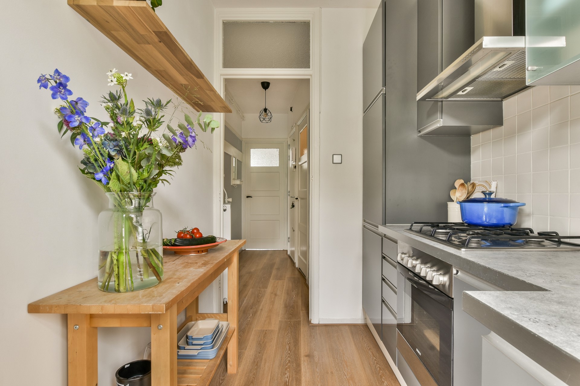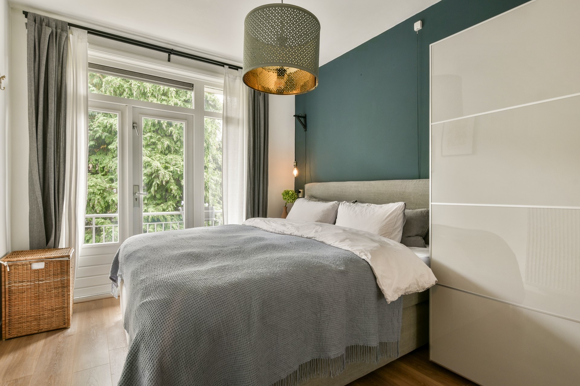 Aan de achterzijde van de woning bevindt zich de ruime slaapkamer en aparte keuken. De slaapkamer wordt middels openslaande deuren met prachtig glas in lood afgesloten van de woonkamer. De slaapkamer is ruim opgezet en beschikt over voldoende ruimte voor een grote kledingkast. Vanuit de slaapkamer heeft u toegang tot het balkon, gelegen op het noordoosten. De keuken is uitgerust met moderne inbouwapparatuur waaronder een koelkast, vriezer, vaatwasser, oven en 4-pits kookplaat. Het balkon aan de achterzijde is eveneens te bereiken via de keuken.