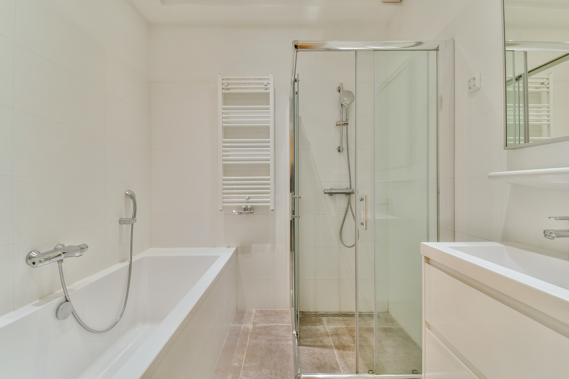 Aan de voorzijde van de woning zijn twee slaapkamers te vinden, beide bereikbaar via de woonkamer. Centraal in de woning bevind zich de riante badkamer met inloopdouche, ligbad en wastafelmeubel.