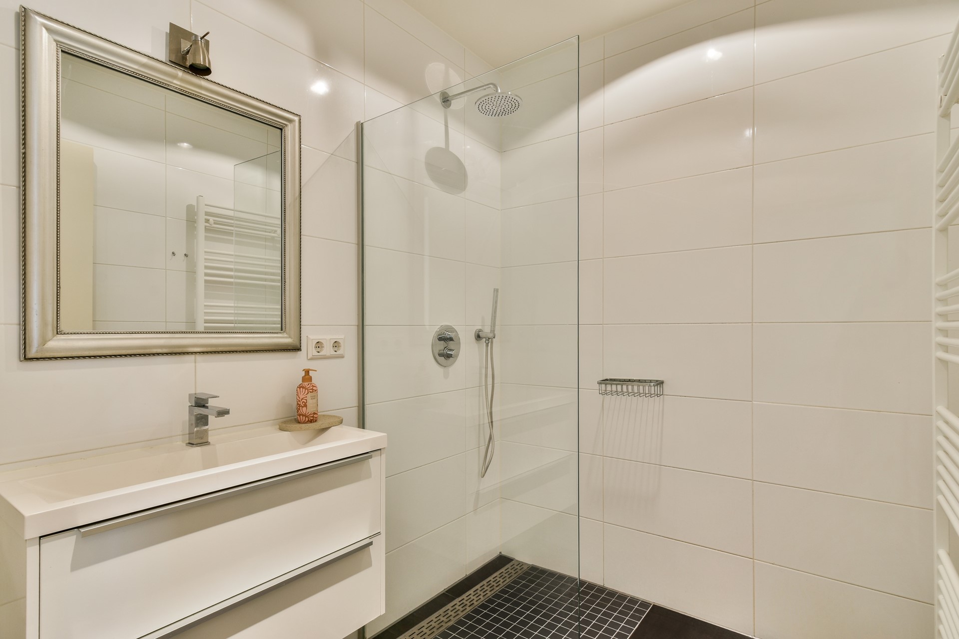 Centraal in de woning ligt de fraai betegelde badkamer, voorzien van een inloopdouche, wastafelmeubel en handdoekradiator. Daarnaast is er een separaat toilet en een handige bergruimte met aansluiting voor de wasmachine.